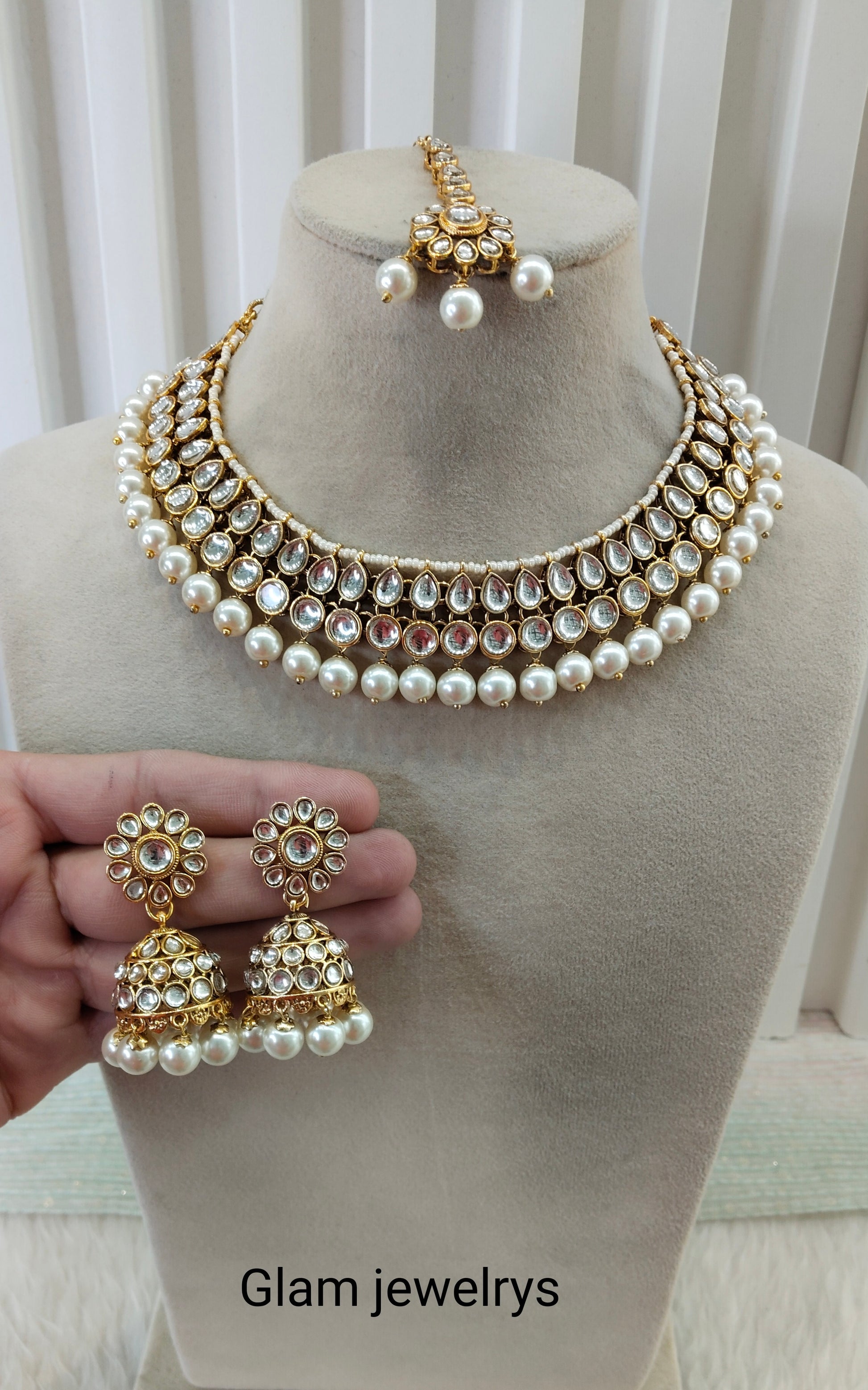 White Gold Kundan Necklace Indian Jewellery Roshan Set